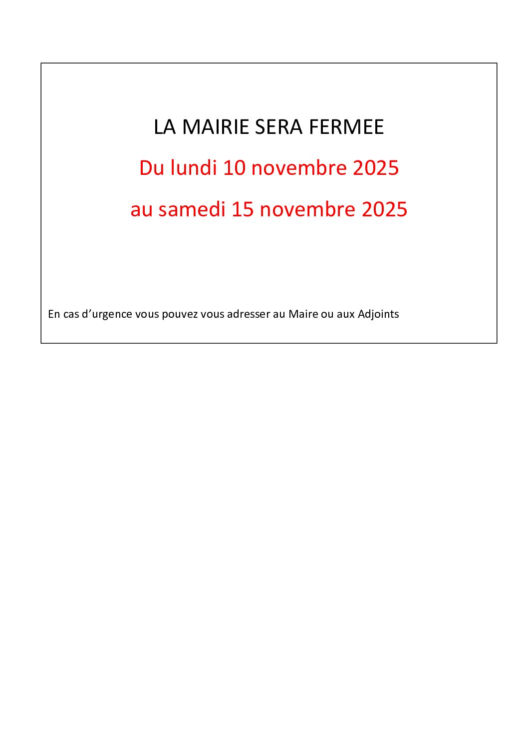 FERMETURE MAIRIE DU 10 AU 15 NOVEMBRE 2025
