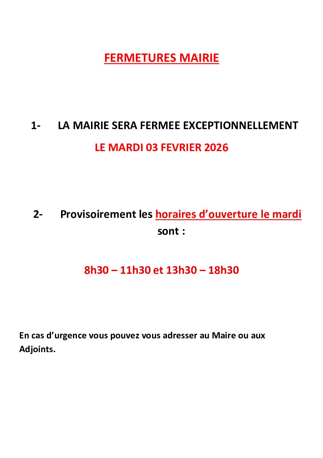 FERMETURE MAIRIE DU 03/02/2026 ET MODIFICATION HORAIRES DU MARDI